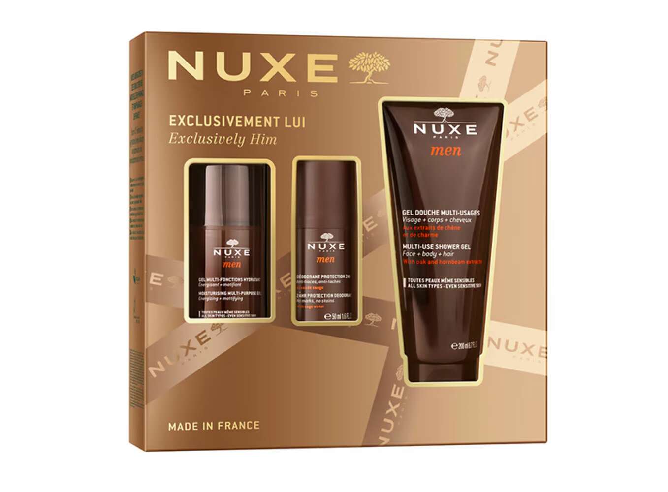 Nuxe Exclusively Him Set Moisturizing Multi-Purpose Gel 50 ml, Multi-Use Shower Gel 200 ml, 4-hr Protection Deodorant 50 ml