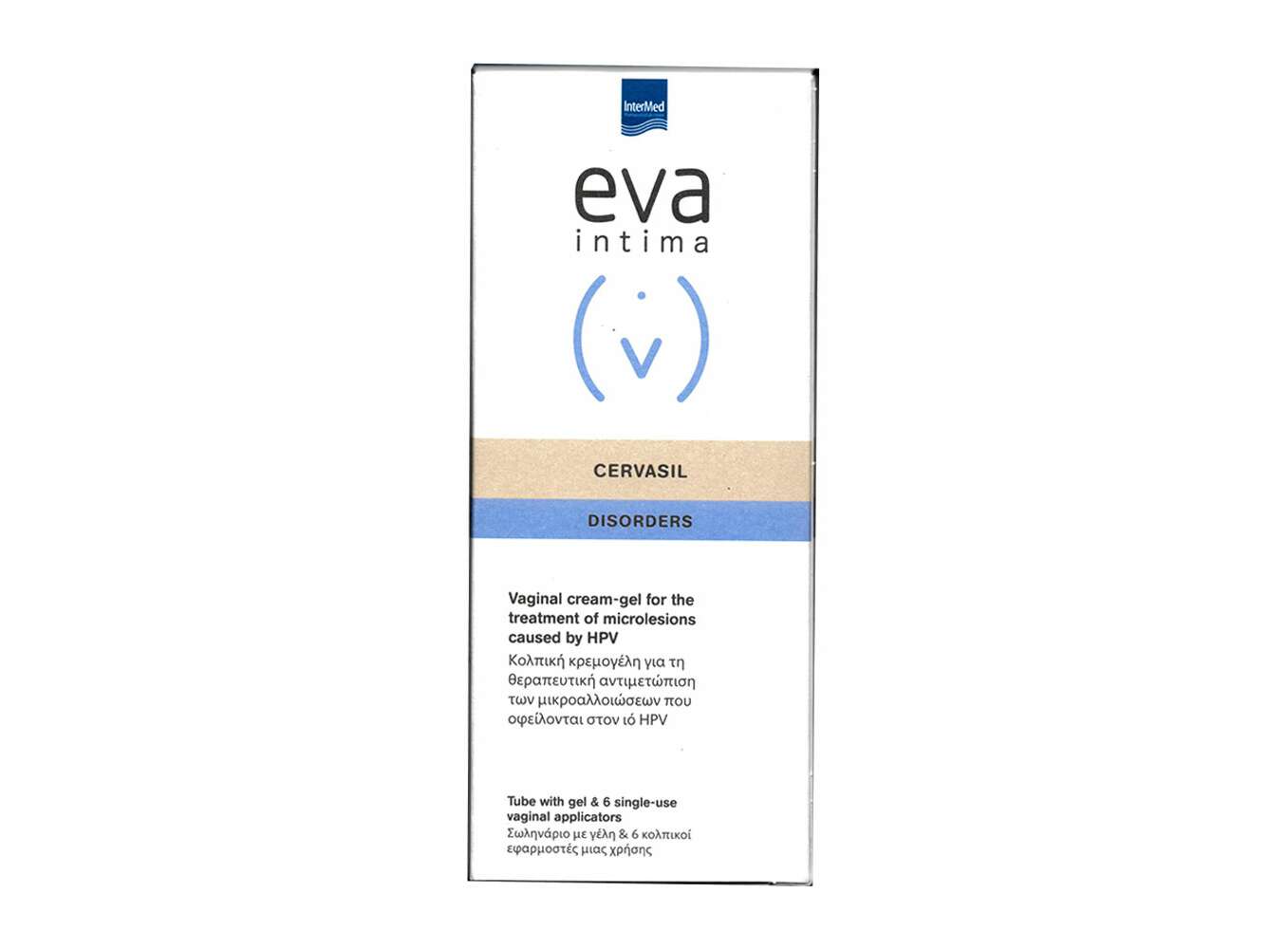 Η Intermed Eva Intima Cervasil Disorders είναι μία κολπική κρεμογέλη της οποίας η σύνθεση δημιουργεί έναν αμυντικό φραγμό ως επιπρόσθετη θεραπεία στην αντιμετώπιση των ενδοεπιθηλιακών αλλοιώσεων που προκαλούνται από τον ιό HPV βελτιώνοντας την διαδικασία επούλωσης του τραύματος.