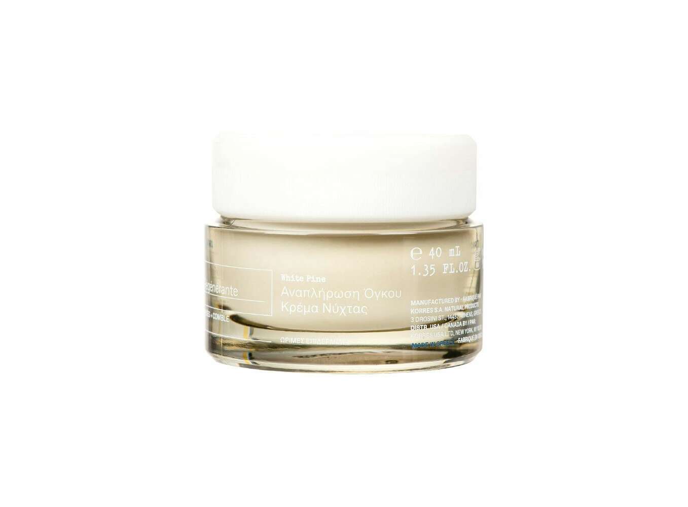 Aqua/Water/Eau, Caprylic/Capric/Myristic/Stearic Triglyceride, Propanediol, Glycerin, Caprylic/Capric Triglyceride, Cetearyl Alcohol, Glyceryl Stearate Citrate, Isoamyl Laurate, Cetyl Palmitate, Crambe Abyssinica Seed Oil, Olus Oil/Vegetable Oil/Huile Végétale, Passiflora Incarnata Seed Oil, Squalane, Ethyl Linoleate, Butylene Glycol, Behenyl Alcohol, Ascorbyl Palmitate, Avena Strigosa Seed Extract, Citric Acid, Cynara Scolymus (Artichoke) Leaf Extract, Dimethyl Isosorbide, Ethyl Linolenate, Ethyl Oleate, Ethyl Palmitate, Ethyl Stearate, Ethylhexylglycerin, Glyceryl Caprylate, Helianthus Annuus (Sunflower) Seed Oil, Lactic Acid, Lecithin, Lonicera Caprifolium (Honeysuckle) Flower Extract, Lonicera Japonica (Honeysuckle) Flower Extract, Nicotiana Benthamiana Hexapeptide-40 Sh-Polypeptide-76, Pancratium Maritimum Extract, Pinus Heldreichii Bark Extract*, Sesamum Indicum (Sesame) Seed Extract, Sodium Carboxymethyl Beta-Glucan, Sodium Citrate, Sodium Hyaluronate, Spilanthes Acmella Flower Extract, Tetrasodium Glutamate Diacetate, Tocopherol, Tocopheryl Acetate, Xanthan Gum, Benzyl Alcohol, Phenoxyethanol, Potassium Sorbate, Salicylic Acid, Sodium Benzoate, Sorbic Acid, Parfum/Fragrance. *Korres White Pine Bark Extract.