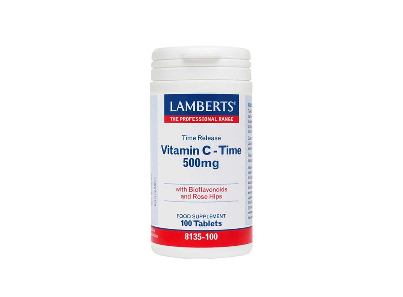 To σκεύασμα Vitamin C Time Release 500mg της Lamberts παρέχει εγγυημένα 500mg Βιταμίνης C σε δισκία ελεγχόμενης αποδέσμευσης και μία σημαντική ποσότητα βιοφλαβονοειδών (ρουτίνη, κερσετίνη, κιτρίνη και εσπεριδίνη) τα οποία συμβάλλουν στην απορρόφησή της από τον οργανισμό και σκόνη καρπών αγριοτριανταφυλλιάς (Rose Hips). Όπως όλα τα σκευάσματα της Lamberts, παρασκευάζεται εντός του Ηνωμένου Βασιλείου σύμφωνα με τα αυστηρά πρότυπα της Φαρμακευτικής GMP (Pharmaceutical GMP).