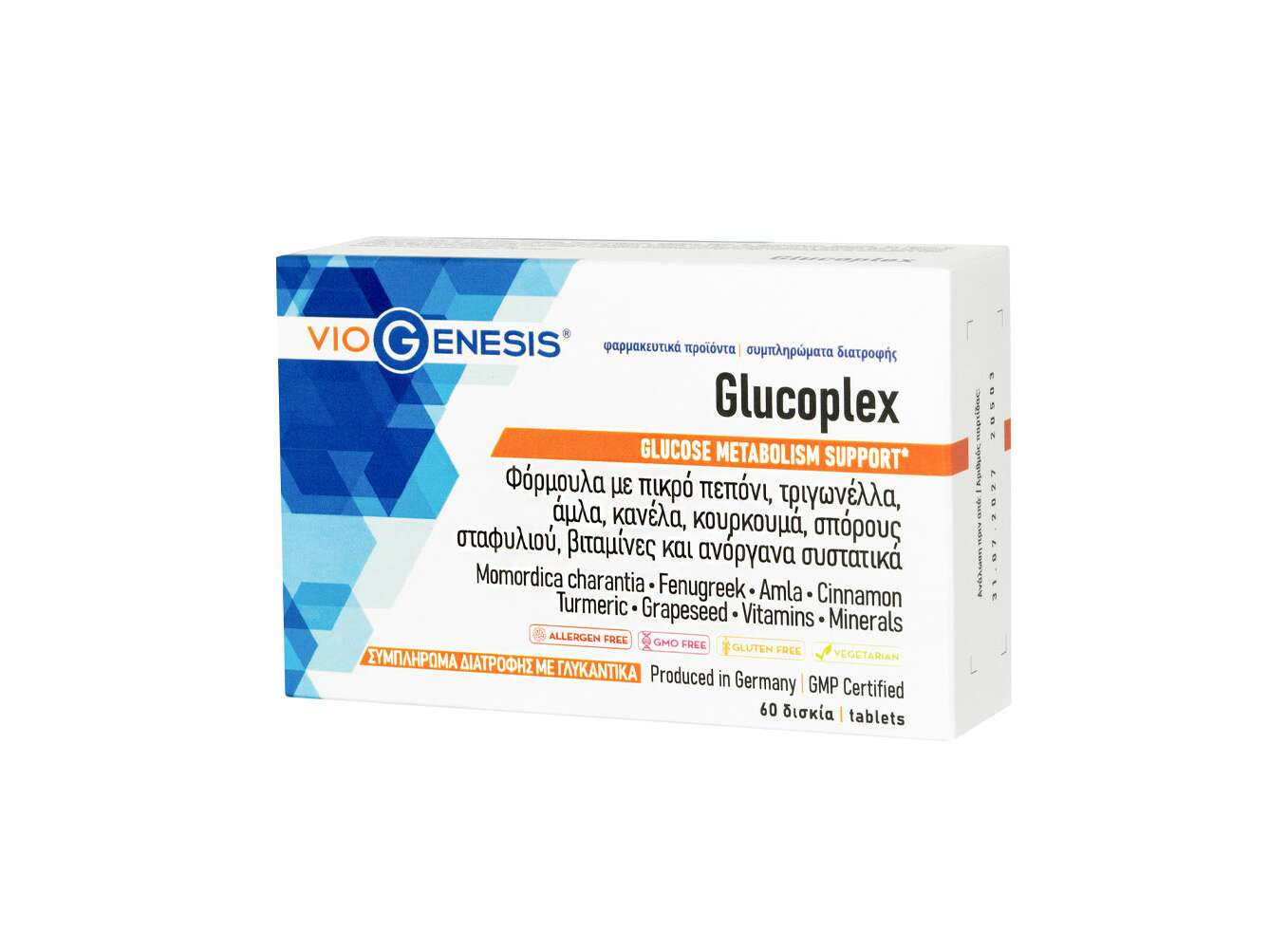 To VioGenesis Glucoplex είναι μια φόρμουλα με εκχυλίσματα πικρού πεπονιού, τριγωνέλλας, άμλα, κανέλας, κουρκουμά, σπόρων σταφυλιού, θειαμίνη, βιταμίνη D και ανόργανα συστατικά, όπως το μαγνήσιο, ο ψευδάργυρος και το χρώμιο.