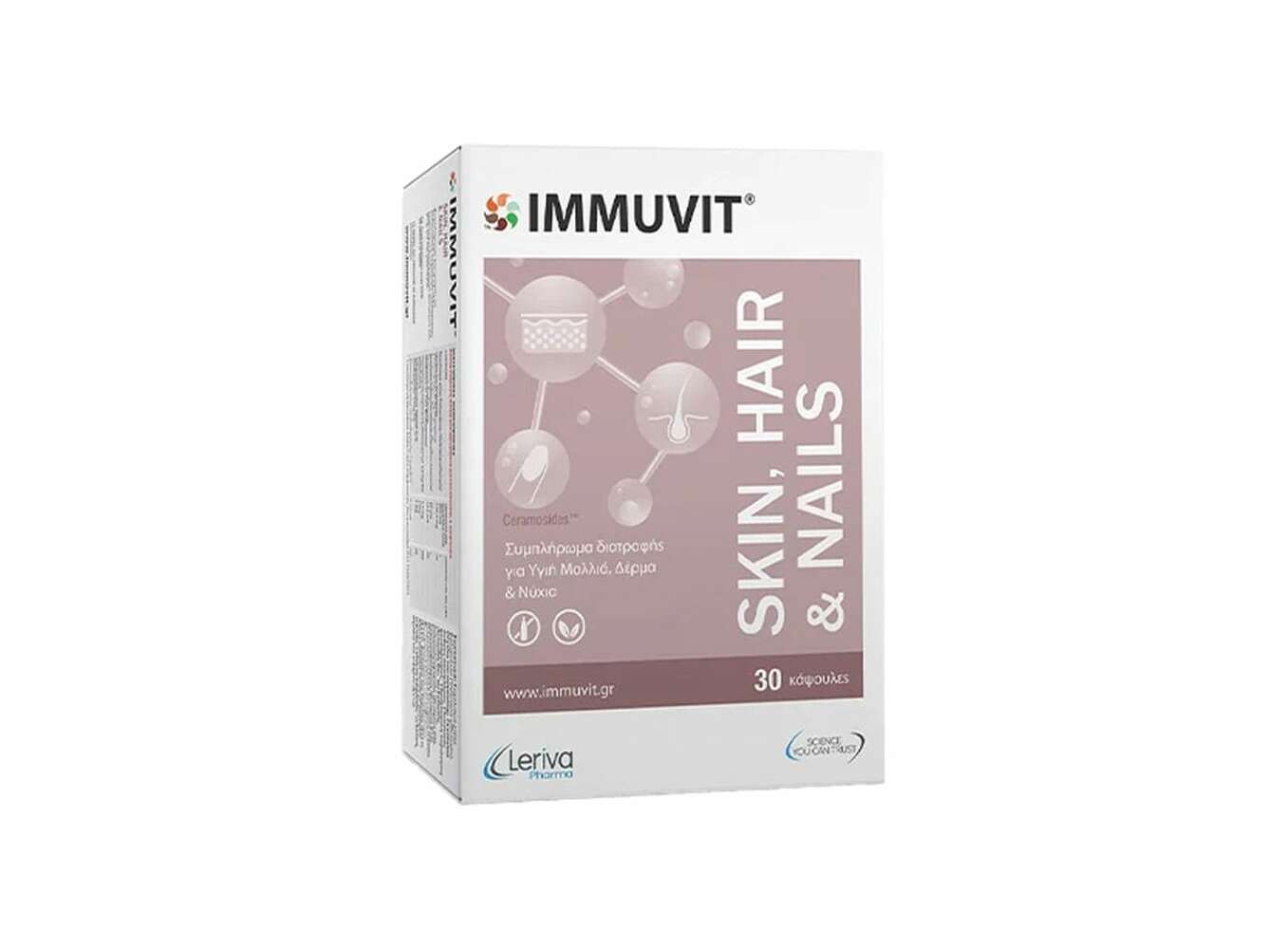 Το Immuvit Skin, Hair & Nails είναι συμπλήρωμα διατροφής με βιταμίνες, μέταλλα, εκχύλισμα bamboo και Ceramosides™, που συμβάλλει στη διατήρηση υγιούς δέρματος, μαλλιών και νυχιών.