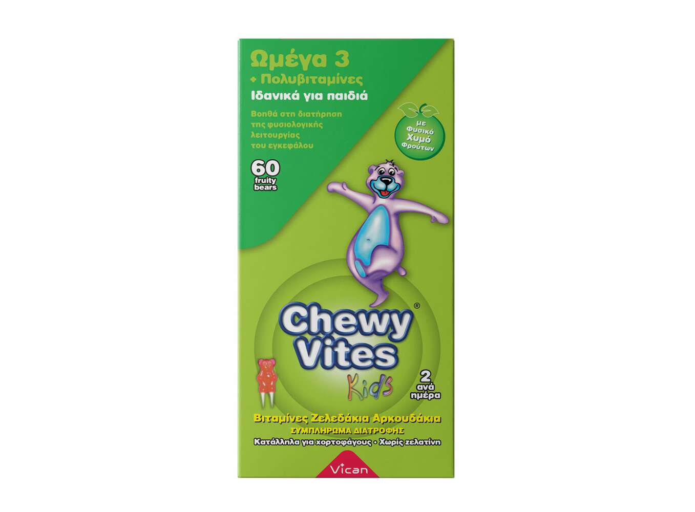 Συμπλήρωμα διατροφής σε ζελεδάκια-αρκουδάκια με βιταμίνες και ωμέγα-3 λιπαρά οξέα που προσφέρει τόνωση και ενέργεια, ενώ συμβάλλει στην ενίσχυση του ανοσοποιητικού συστήματος και στη διατήρηση της φυσιολογικής ανάπτυξης και λειτουργίας του εγκέφαλου. Με φυσικό χυμό φρούτων.
