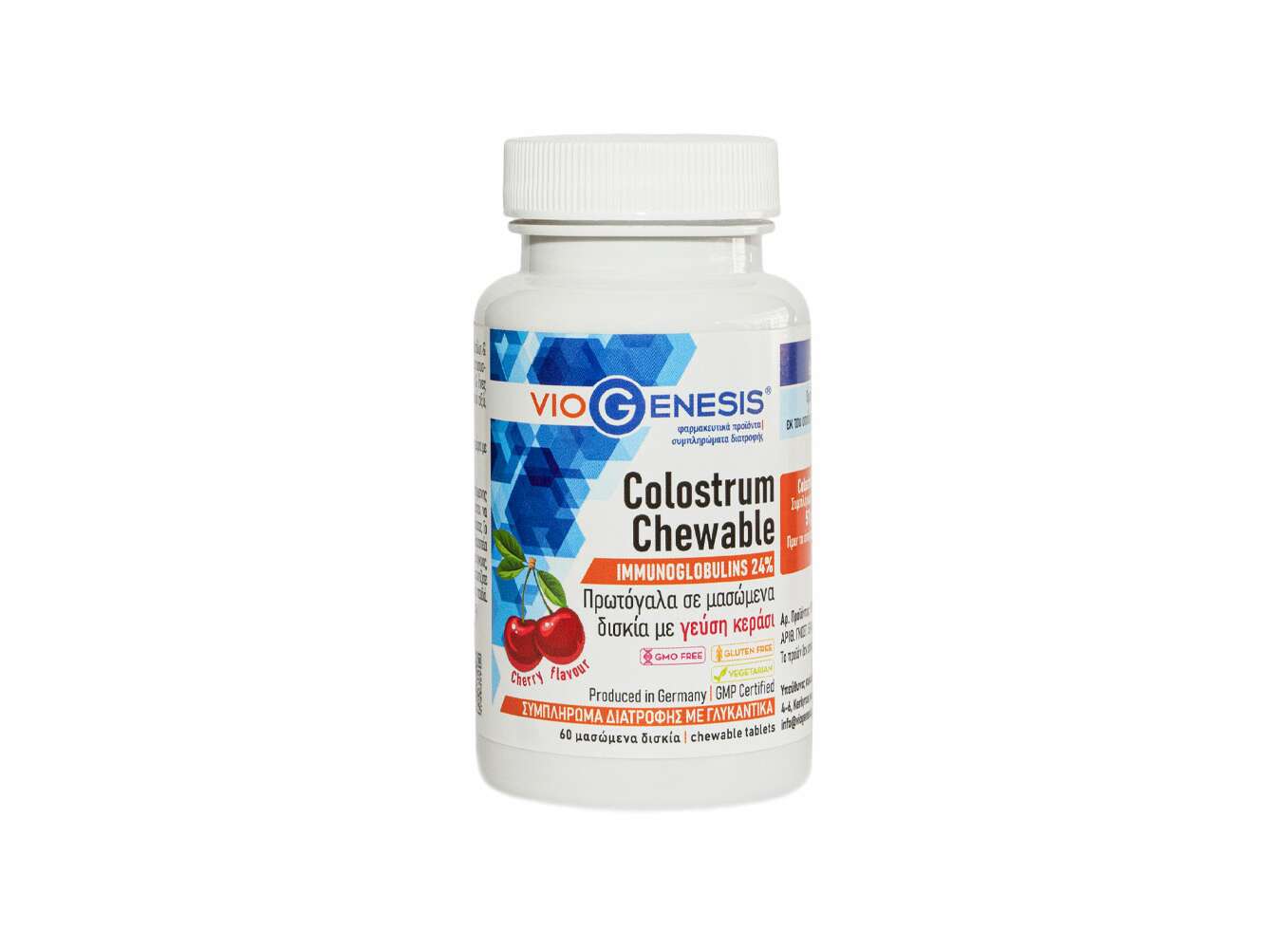 Το VioGenesis Colostrum Chewable είναι ένα συμπλήρωμα διατροφής με πρωτόγαλα σε μασώμενα δισκία με γεύση κεράσι και γλυκαντικά.